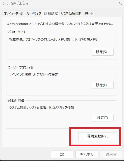1.windowsボタンを押します 2.環境変数と入力します 3.システム環境変数の編集を押します 4.↓画像の「環境変数」を押します