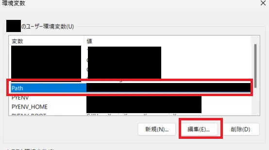 5.ユーザー環境変数のセクションのPathを選択して、編集を押します