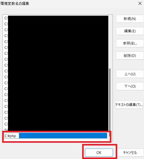 6.「新規」を押して、先ほどインストールしたphpのフォルダを指定します。(僕の場合はC:\php)