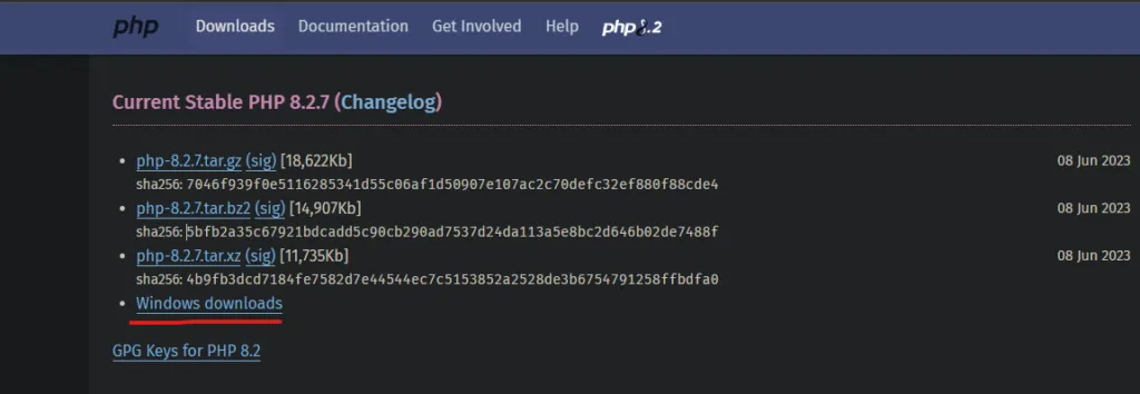 次に実行環境の作成です。 今回の言語はPHPにします。以下のPHP公式サイトから「Windows downloads」を押してください。 current stable(現在の安定バージョン)を選べばOKです。