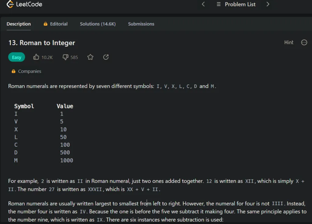 ローマ数字を算用数字に変換する問題ですね。与えられたローマ数字を前から順に読んでいく場合、基本大きいシンボルから出現することを利用すれば解けそうです。(大きいシンボルから出てこないときは4や9に10^nをかけた数字の時)