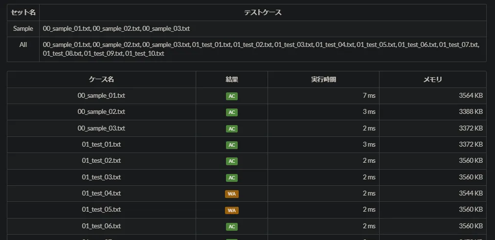 僕のような初心者はすべての場合を想定することが難しいので、テストケースの内容を表示してほしいところです(´;ω;`)